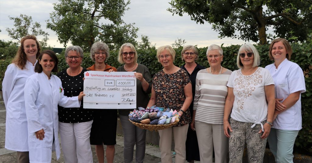 Bei der Spendenübergabe: Dr. Claudia Löffler (Zweite von links), Beate Beyrich (Dritte v.l.) und Marianne Lotter (mit den Portkissen) sowie weitere Vertreterinnen des Uniklinikums Würzburg, des Fördervereins zur Unterstützung der Komplementärmedizin für onkologische Patienten e.V, und der Waldbrunner Nähgruppe.