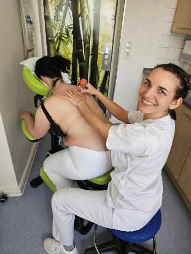 Dank der großzügigen Spende des Fördervereins können sich jetzt die Patienten*innen auf dem neuen Massagestuhl während der wohltuenden Schröpfkopfmassage noch besser entspannen.
